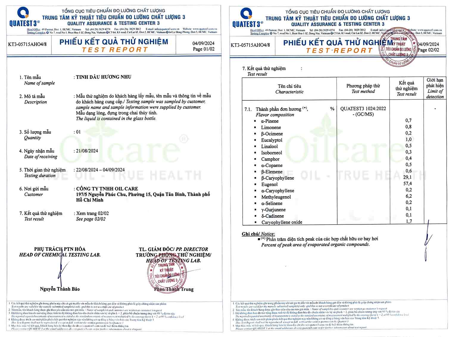 Xem chi tiết bảng kiểm nghiệm chất lượng Tinh Dầu Hương Nhu bán buôn mới nhất của QUATEST 3